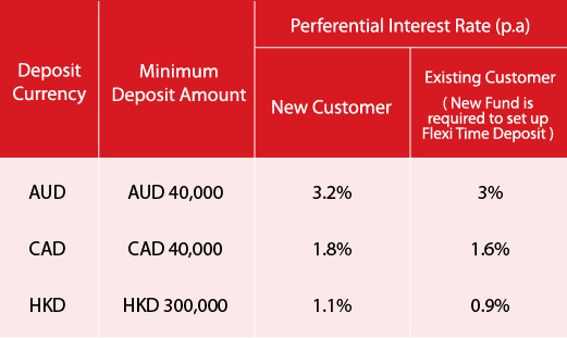 •Currency choices of HKD, CAD and AUD are available, which you can choose to change the deposit currency in the 3rd and 6th month of the Flexi Time Deposit