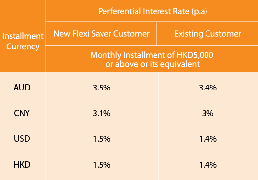 You can also opt for the Flexi Saver, which allows you to switch between HKD, USD, CNY and AUD as the deposit currency of your monthly fixed-amount installment, in achieving your wealth accumulation goals.