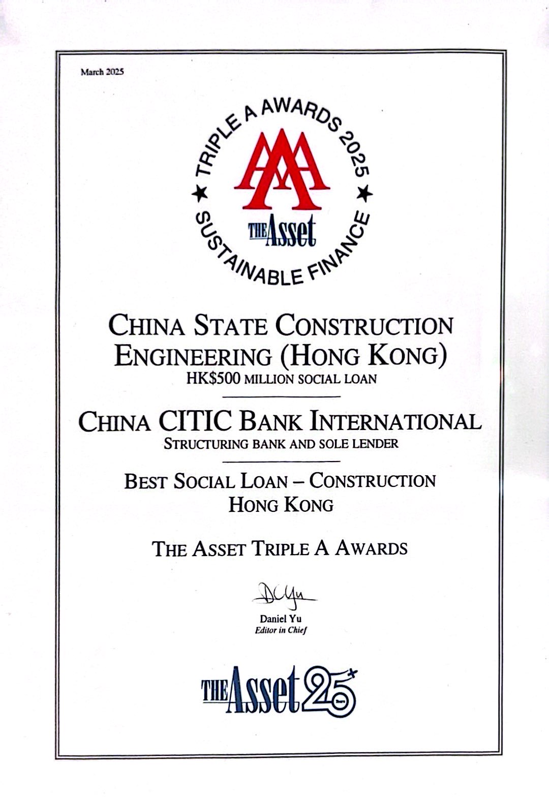 《财资杂志》The Asset Triple A Awards 2025「香港地区最佳社会责任贷款 - 建筑行业」