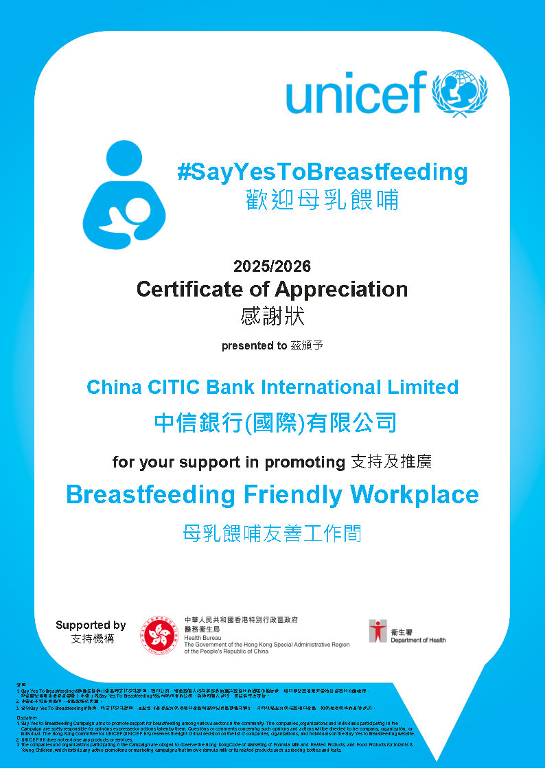 獲聯合國兒童基金香港委員會頒發感謝狀以表揚本行支持及推廣「母乳餵哺友善工作間」