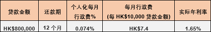 1. HK$800,000的获批核金额、个人化每月行政费0.074%及以12个月还款期所计算, 实际年利率为1.65%。例子只供参考。最终批核之实际年利率将根据客户的信贷评级及其他相关审批贷款因素决定,本行保留贷款批核,适用利率及手续费的最终酌情权。