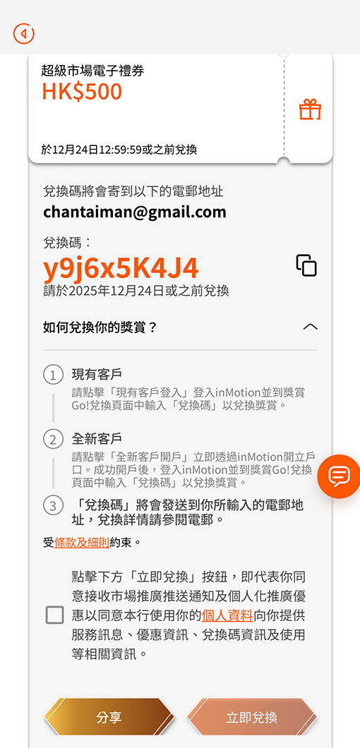 6 如成功搶到獎賞,頁面會顯示相關「兌換碼」,緊記選取同意接收市場推廣推送通知,而你亦會收到確認電郵