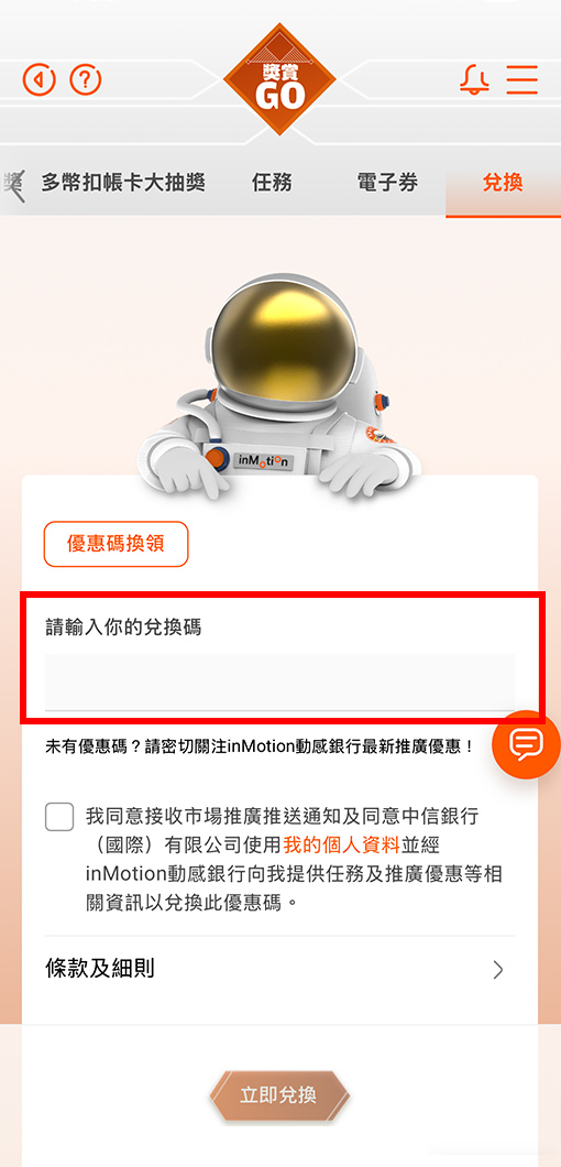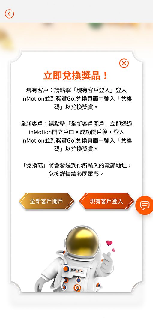 2 如你是現有客戶,請登入inMotion並到獎賞Go!兌換頁面。如你是全新客戶,請立即透過inMotion開立戶口以兌換獎賞
