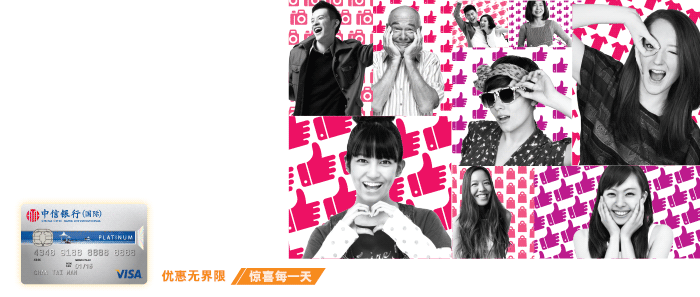 信银国际VISA白金卡让你随时随地赚取高达0.55%现金回赠*,无时限、无商户限制、无商户消费金额要求!於指定签账期#内更可享高达5%额外现金回赠+。现成功申请可享三重迎新优惠!