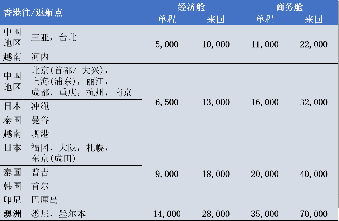中信银行(国际)香港航空Mastercard®卡持有人尊享5折FWC积分兑换以下指定航班传统奖励机票。