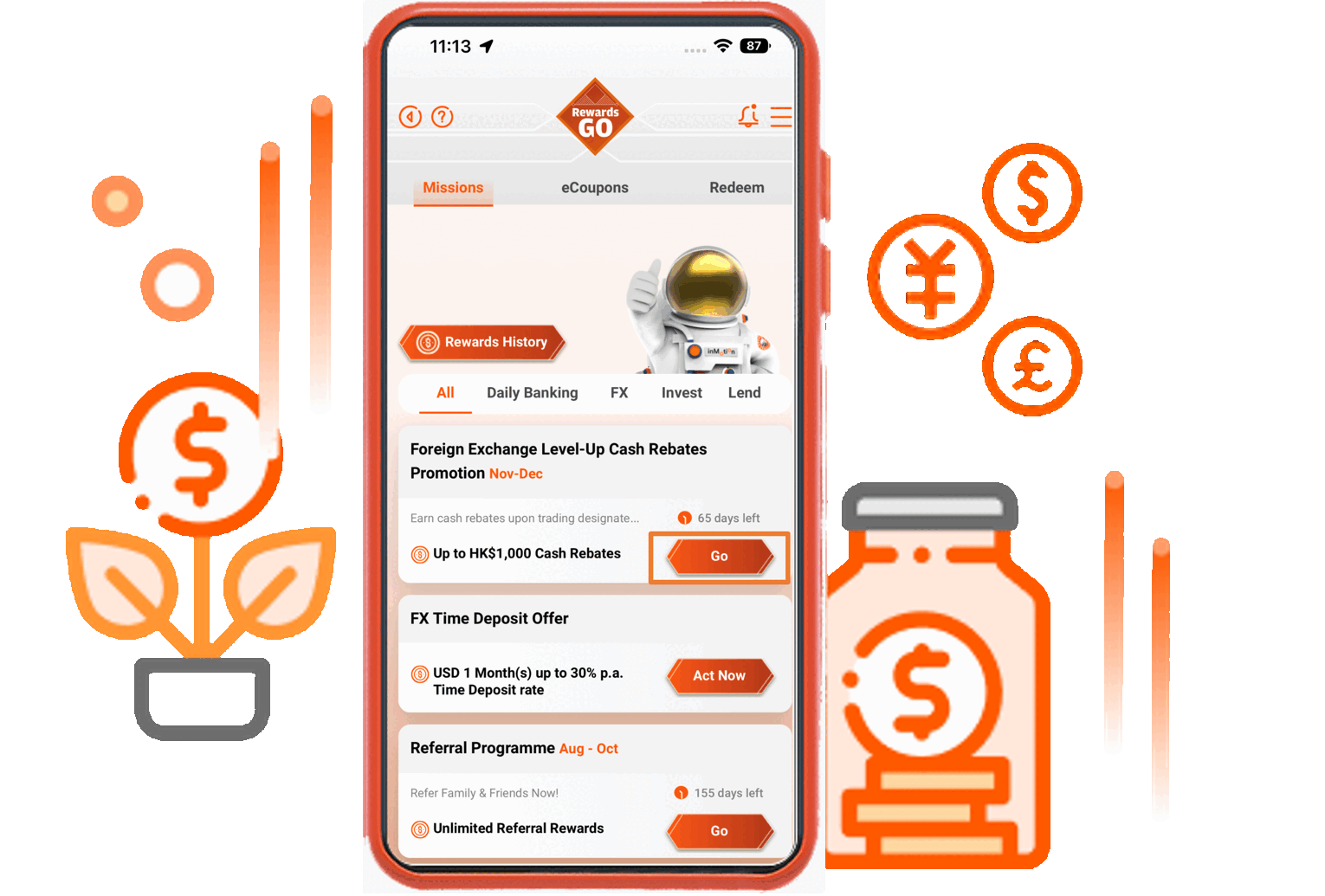 *“Foreign Exchange Level-Up Cash Rebates Promotion” is a personalized mission, thus, each selected customer might receive different personal trade targets and cash rebates. Cash rebates of up to HK$1,000 are only applicable to selected customers who did not trade FX via inMotion during 1 February – 31 October 2025, and are subject to quota limitation and on a first-come, first-served basis. Other customers are also eligible for personalized cash rebates. he maximum cash rebates each customer is entitled can be referred from the “Foreign Exchange Level-Up Cash Rebates Promotion” mission in "Rewards Go!"