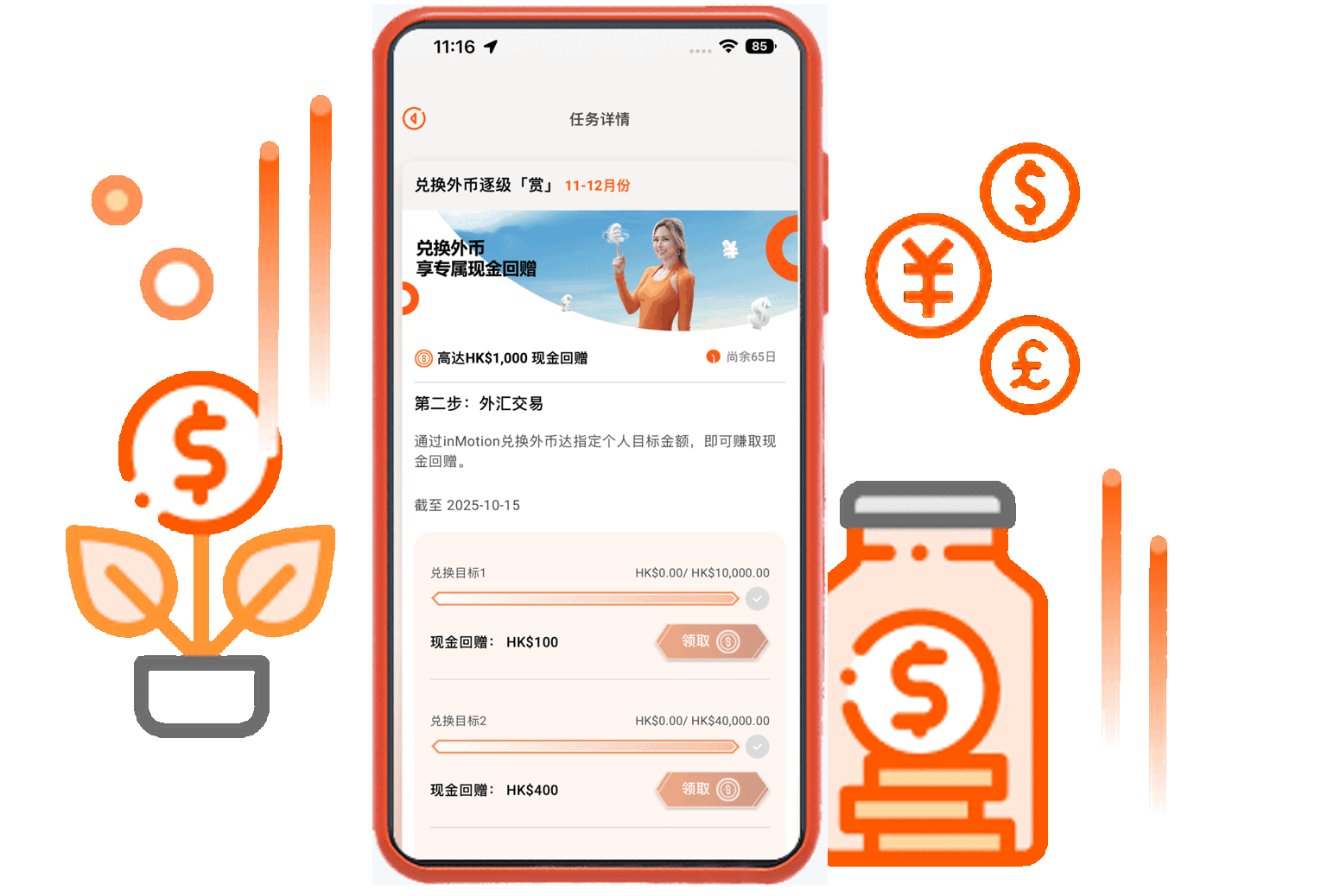 *「兑换外币逐级「赏」」为个人化任务,因此每个客户都有机会收到不同的个人目标金额及现金回赠。高达HK$1,000现金回赠则只适用于特选客户,即由2025年2月1日起至2025年10月31日未曾于inMotion兑换外币之客户,高达HK$1,000现金回赠名额有限,额满即止。其他客户亦可享个人化现金回赠,而每个客户可获得之最高现金回赠金额可以参阅「奖赏Go!」之「「唱住「赏」逐级奖」任务。