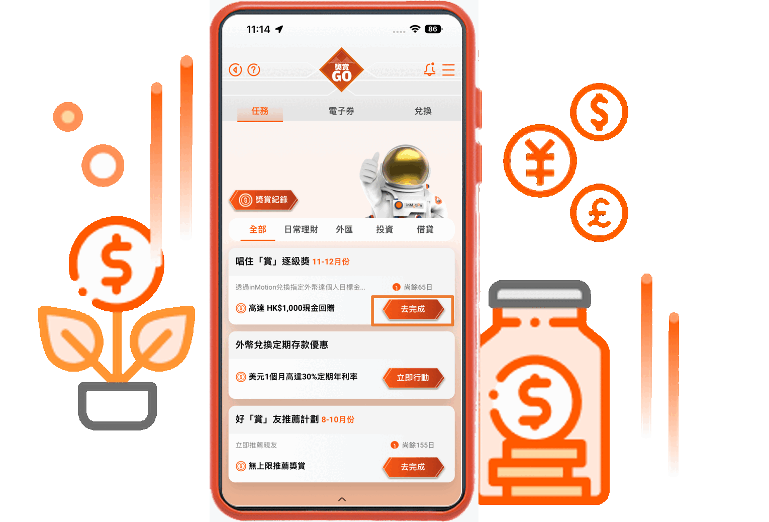 由2025年11月1日至12月31日,中信銀行(國際)多幣扣賬卡持卡人玩「獎賞 Go! 」唱住「賞」逐級獎*任務,只需於inMotion完成個人化指定外幣交易^目標即可賺取現金回贈#!更特設升級獎賞,唱得越多,回贈越多*,讓你越唱越「賞」唱更多!