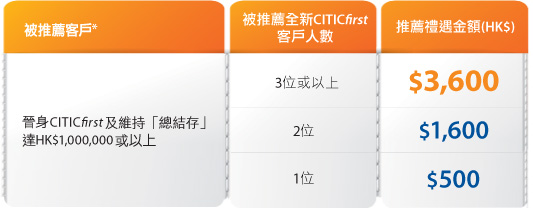 立即行動!被推薦親友成為CITICfirst客戶亦可尊享高達HK$13,700獎賞! 有關CITICfirst客戶推廣詳情,請按此。
