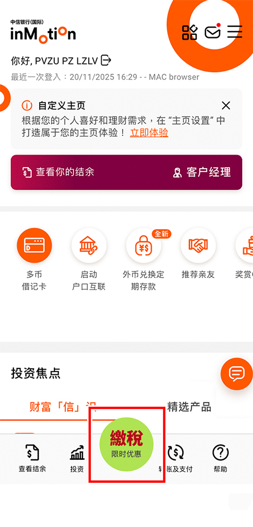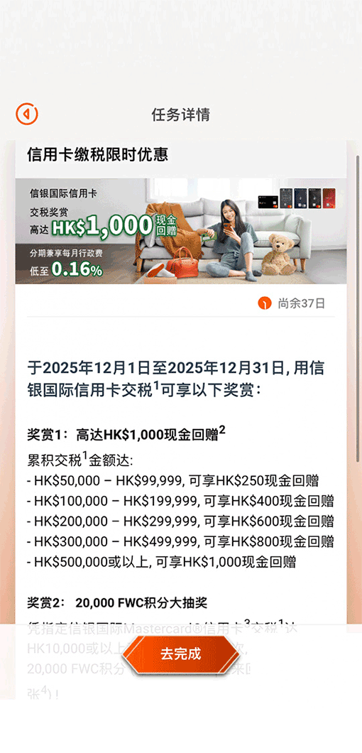 凭指定信银国际Mastercard®信用卡3交税1达HK10,000或以上可获得抽奖机会1次,