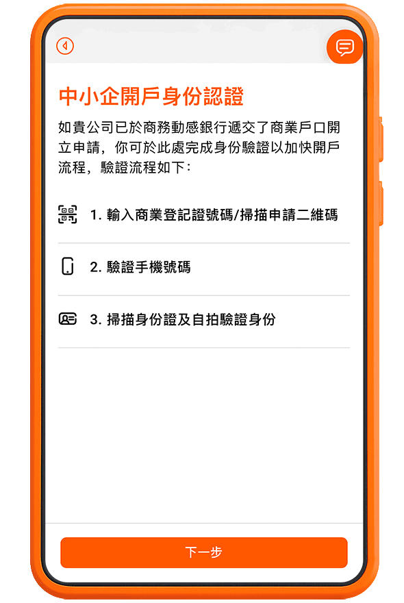 「商務動感銀行」中小企申請開立商業戶口服務只適用於有限公司或合夥或獨資經營的企業客戶。公司必須於香港註冊或登記,只具有1層擁有權/控制權結構,並且所有有關人士為自然人及持有香港身份證或中華人民共和國居民身份証。